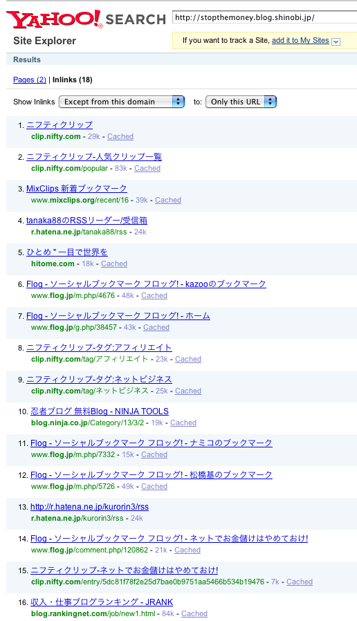 さて、インデックスの状況を見てみましょう。YahooSiteExplorerによると現在2ページだけインデックスされ、リンクは18ついています。サイトエクスプローラの画面はこれ。
