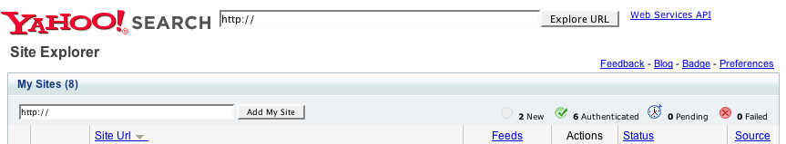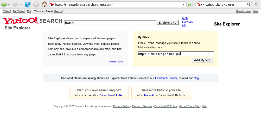 Yahoo SiteExplorer(サイトエクスプローラー) を使うには、yahoo japanではなく、yahoo.comのidを取得する必要があります。まずYahoo SiteExplorer(http://siteexplorer.search.yahoo.com)にアクセスして My Siteにurlを入れ[Add My Site]をクリック。【画像内のurlは記入例です】