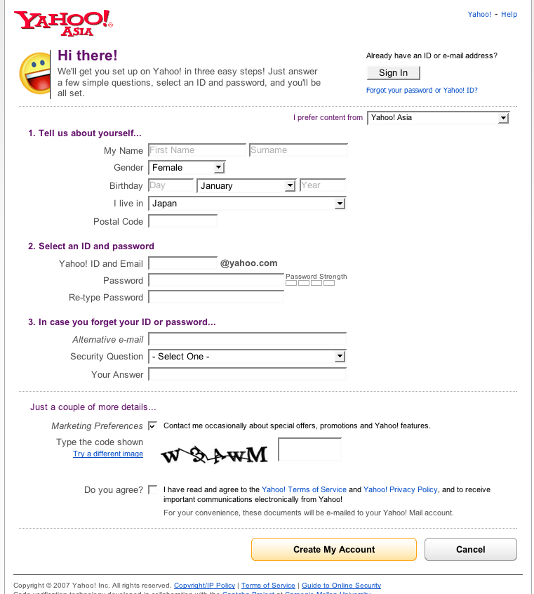 なまえ、性別、誕生日、国、郵便番号を入れ、ID(メアドと共通)、パスワード2回、さらにパスワード忘れたときのための連絡用メアド、質問と答、を入れ、認証コードを入れ、最後のDo You agree?(規約)の□をチェック。[Create my Account]で登録です。データを入力中、idがだぶってて登録できないとか、誤字脱字があると、いちいち間違い直しアドバイスが出ます。別にトラブルではないので心配せず、修正しながら入力作業を進めてください。