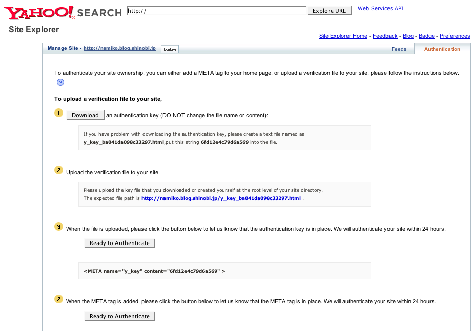 <META name="y_key"〜 >を自分のブログのテンプレートの(<head> と</head>の間)にコピペします。そして。SiteExplorerの画面に戻り、一番下のWhen the META tag is added〜[Ready to Authenticate]を押して終わりです。半日〜日後、サイトが認証されているか確認します。