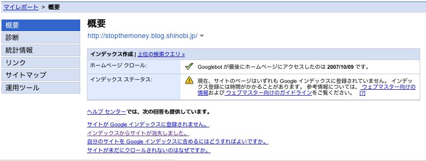 現在(10月19日)、Google Webmaster toolsの管理画面で、このサイト「お金儲けはやめておけ!」の概況はこんなふうに出ています。